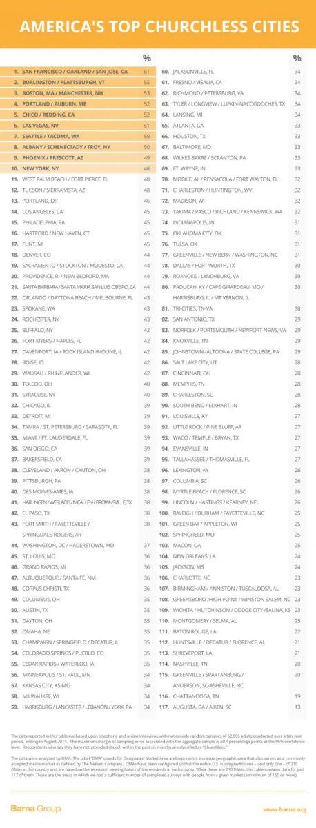 // [Update April 2015: via Barna Group’s What Are the Least Churched Cities in the U.S.?]